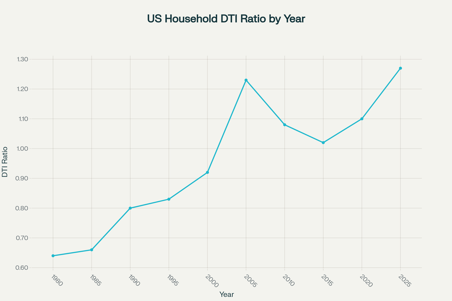 1980s: The national household debt-to-income (DTI) ratio averaged 0.64, meaning households owed about 64% of their annual income in total debt.