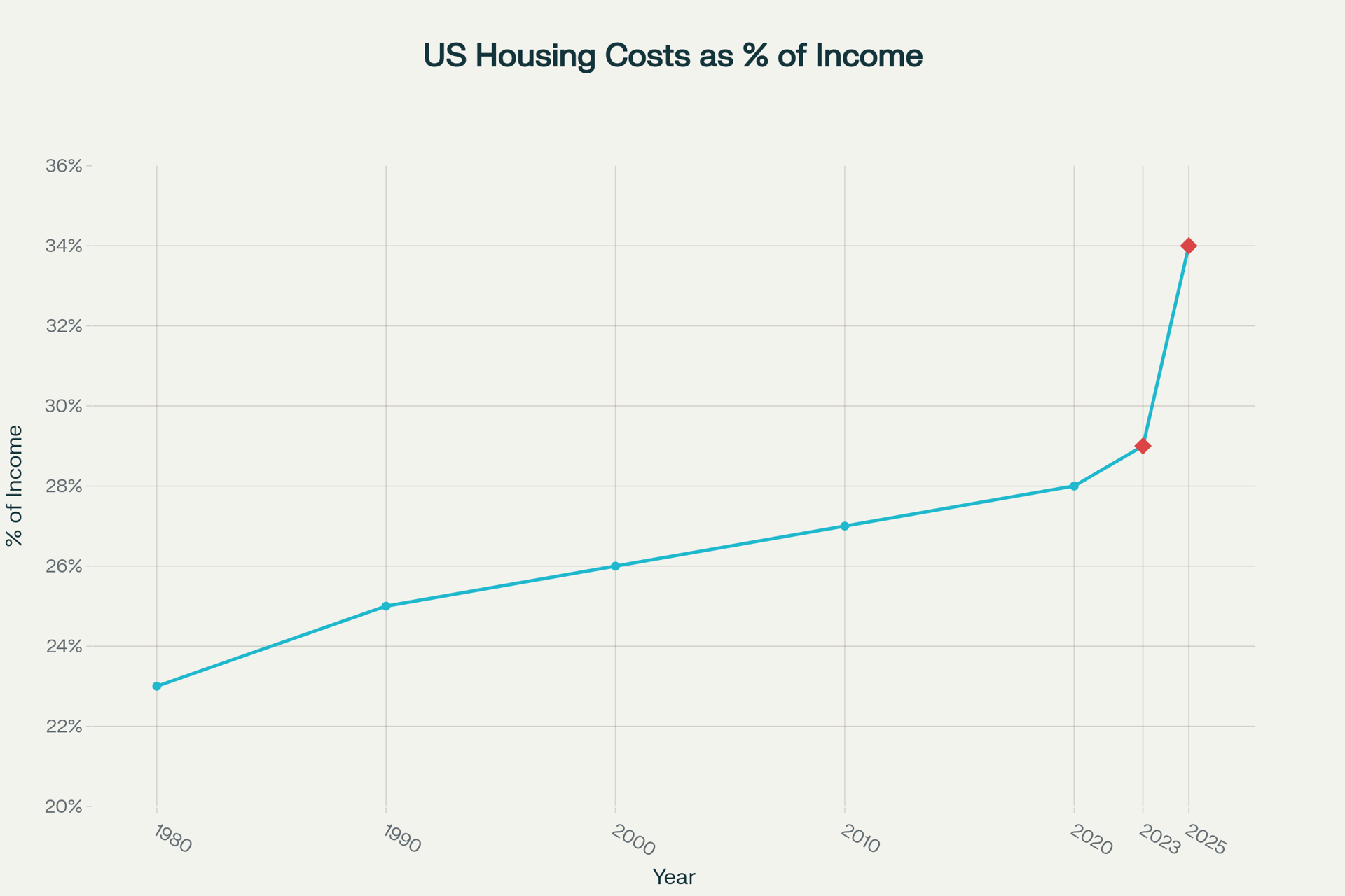 In 1980, housing accounted for about 23% of household income. By 1990, that figure had climbed to 25%, rising steadily through the 2000s. After modest gains in the 2010s, affordability eroded sharply post-2020, with housing costs now consuming roughly 34% of income on average—a level not seen in more than four decades.